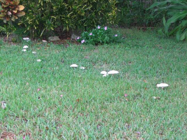 These are mushrooms on my front lawn that are known as "Fairy Rings". I read about these in the local paper last week. Apparently they grow in a semi-circle like this for some unknown reason. The theory is that they grow from fungus from old dead trees and a very wet rainy spell, or from fungus from fertilizers or other chemicals spread on the lawn. I have no idea. They just appeared this year. There are no old dead trees around so what's your theory? Any mushroom fans out there? |