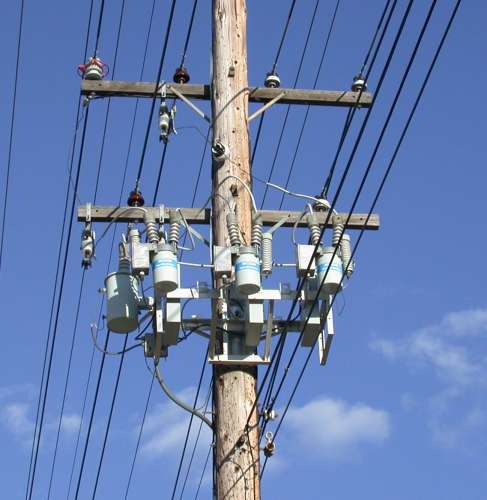Capacitor control to adjust the power factor of a distribution line. all components are visible except controller. Sensor (replaces one insulator), cutouts, oil switches, and capacitors.
