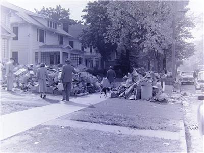 Call this an "estate sale", "tag sale", "rummage sale" or whatever you would like. This definitely was not a "garage sale" from the display of wares that you see here on somebody's front lawn for public viewing and carefully sifting thru. Anyway, it seems like this total-cleanout-sales event nonetheless attracted some curious onlookers as captured here on film in this vintage photo. Imagine all of the great stuff probably available for next to nothing here...comparing to what you'd get for it nowadays on eBay, etc... Yikes!! |