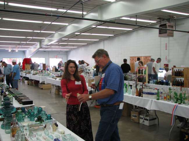 Vickie Stroeber & Jerry Simmons discussing a bottle. WOW!!, Look at all that glass.