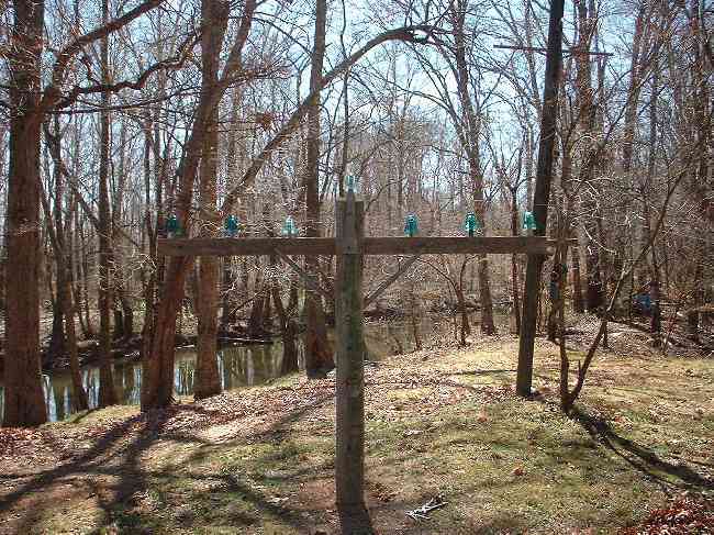 This is the pole I put up in my back yard. I found the crossarm in the creek down in the woods and brought it home and made some pins with pieces of a broomstick and some tape and put them on the crossarm. Later on I cut down an abandoned pole also in the woods, cut the top of it off and brought it home. I spent 3 days trying to pull an old clothesline pole up out of the ground. I finally got it up and set the new pole in the hole. I went and got the crossarm and put it on the pole along with a center pin and put a CD 154 Whitall Tatum on it but later changed it out with a clear CD 257. The pole itself stands a little over 5ft tall. |