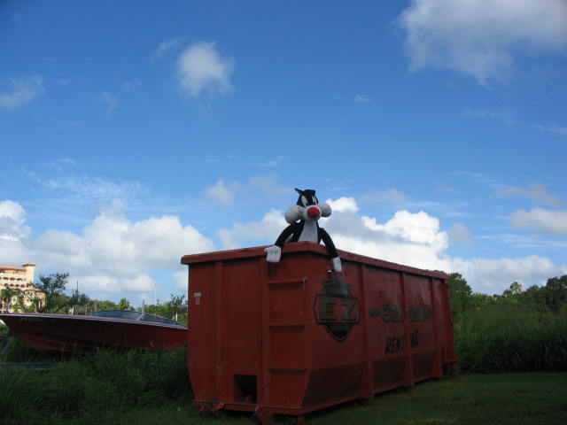 A neighbor of mine was cleaning out her house and garage and came across this stuffed cat she had won or her boy friend had won many years ago and thought she woud class up the dumpster a little. Help me, someone!