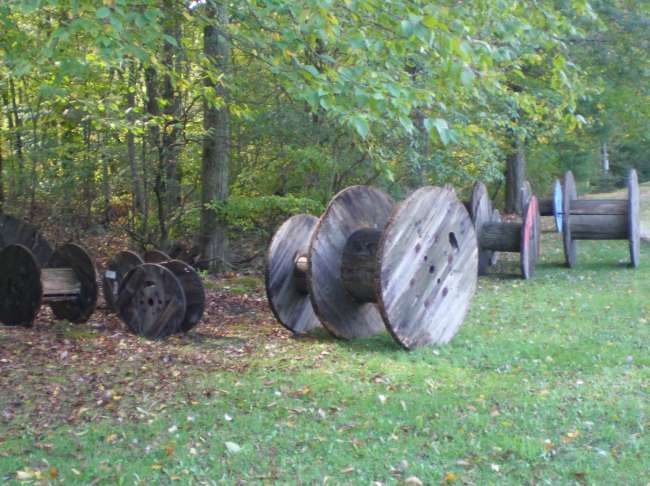 Work to be done. The tables have been removed from storage (the woods) and now have to be rolled down the drive to be setup. These cable spools have served many a year. This was Friday afternoon.