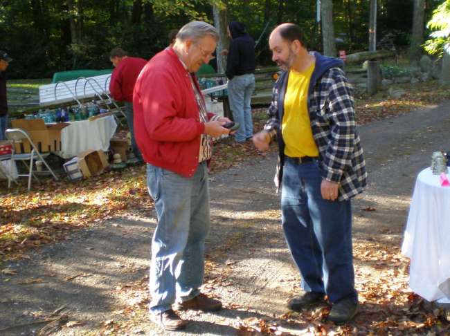 Rick Wiesman is trying to figure out what Karl Hasenstein has picked up. Two porcelain donut shaped pieces. One is blue the other is green. I know my brother in law found some of the green ones in an old trolley barn in Hartford.