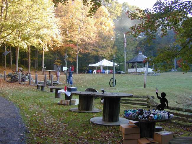 Still early, but the spools are out, and they serve double purpose as tables. In the background, the gazebo and tent is set up ready for Larry's cooking. This BBQ was a little later in the year, and you can see some color in the trees.