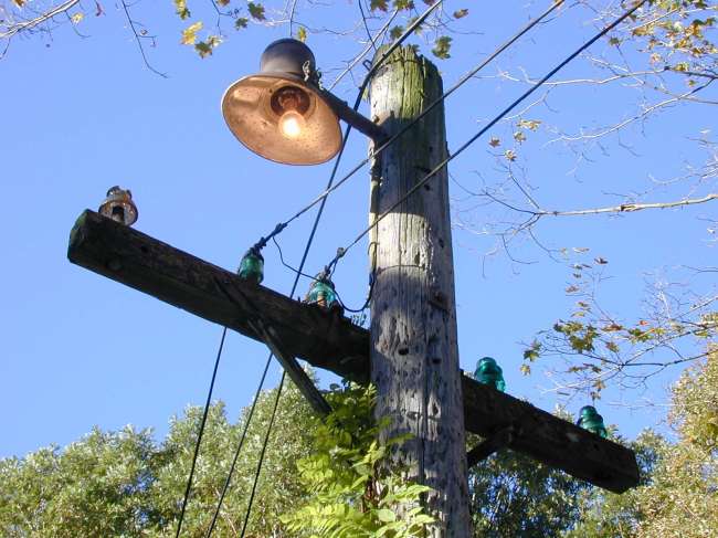 Larry is a retired lineman, so he can do this safely... This is the power going to some street lights along his driveway. Several of the taller utility poles leading up to his house also sport nice insulators, like a pair of Mickeys on one pole.