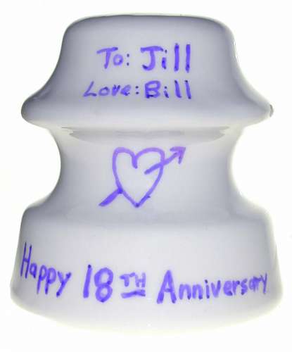 Well, after extensive research on the Internet, they say porcelain is the "modern" gift for your 18th anniversary. There is no "traditional" gift, except for every 5 years after your 15th... So, what could be more appropriate from an insulator collector to an insulator collector? ;-) The above glaze ink marking is in purple, but that was hard to reproduce with the camera. Jill loves purple :-) Happy 18th Anniversary Jill! Love, Bill (Here it is all [id=197058060; custom gift wrapped]) |