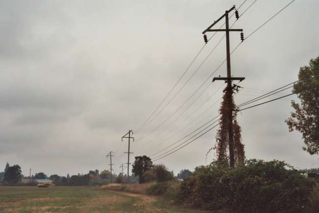 Portland General Electric Co., (PGE) serves all of the area surrounding Forest Grove, Oregon and here is an older style 57,000 volt line with the "wishbone" crossarm formation located just south of town. This style of construction comes in two forms, the level bottom arm type shown here and a style with the bottom arm at an angle, which PGE also used. They started using this construction around 1948 but is now out of use due to pole mounted line posts. Hard to find a stretch of them together for this long of a distance, but this particular line has not been "fussed with" much. I am keeping my fingers crossed! |