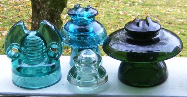 The MIVA is a one piece uni-part power insulator the mini-muncie is a Hemingray-23 with a Hemingray-16 extention that is not part of the real insulator and is considered an altered insulator, the cone head is a unmarked Polish insulator and the Columbia is there just to show the size comparison. |