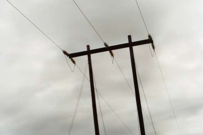 This double dead end H structure pole is just before the switch station and right next to the highway. It is definately an original structure since the poles are untreated, gray, weathered cedar and every insulator disk is a pyrex. Some are brilliant orange carnival and really stand out in the sun but are mixed with the lighter colored variety. Unfortunately, the sun was clouded over when I snapped this shot...typical Oregon! |