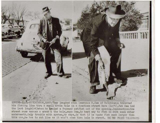 Typewritten caption for this c.1952 news article reads: "KPP292-11/1-HUTCHINSON, KANS: They laughed when Lawrence R. Gee of Hutchinson threated his fishing line thru a small drain hole in a downtown street here (left). But Gee had the last laugh (rt) when he hauled a 2-pound catfish out of the opening. Explanation: the street runs across a creek & the hole, says Gee, is the best way to fish in dark cool water underneath. Only trouble with (the) system, he says, is that if he hooks fish much larger than this one, he has to cut line as it won't come thru hole in the street. UNITED PRESS TELEPHOTO" |