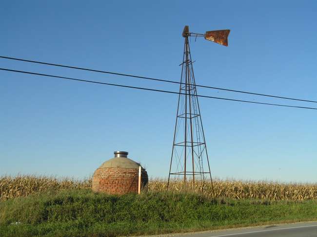 This is an old brick water tank set on a high spot very near Indiana highway 6 west of Kendallville, Indiana. There is the remains of the windmill that filled the tank which might have been used for a house, or maybe to irrigate the nearby fields. It's about 10 feet tall. I don't know how rare these are, but it's the only one I have seen. |