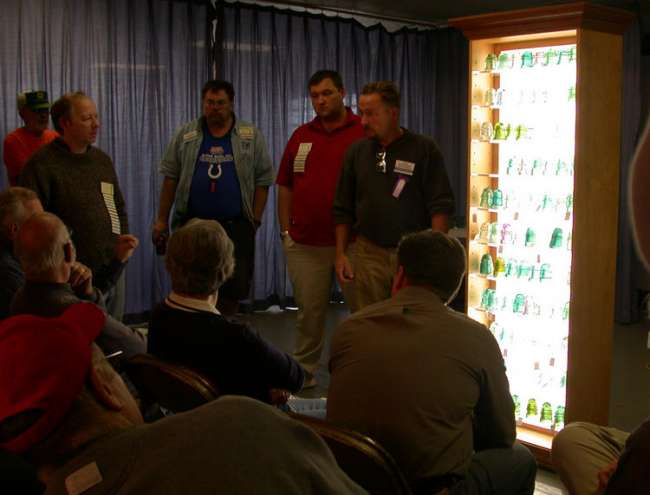 On Saturday there was a research seminar covering two Hemingray products - specifically the #5 (CD 120) and the #4 (CD 124.1, 124.2, 124.3 / 124.5 and 124) styles. I'm not sure who all was in the 'peanut gallery' (other than Mike Corn in front of the GOM) but standing from left to right are: Glenn Drummond, Bill Meier, Gene Hawkins, Bob Stahr, and Brent Burger. |