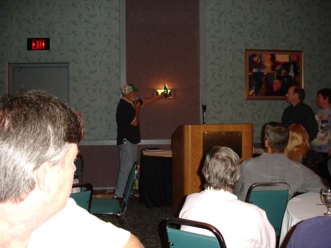 Springfield Mid-Ohio Show Nov. 3-4, 2007 Display awards presented to our displayers at the banquet dinner Saturday night at the Holiday Inn, Glenn is holding the Glass Award from the City of Springfield to a light so we can all see the beauty of it. This award was presented to Bill Meier's display. |