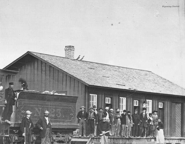This is a picture of the now gone, Wyoming Station. It was the first station north of Laramie along the Laramie River. Biddles on brackets are seen on the roof.