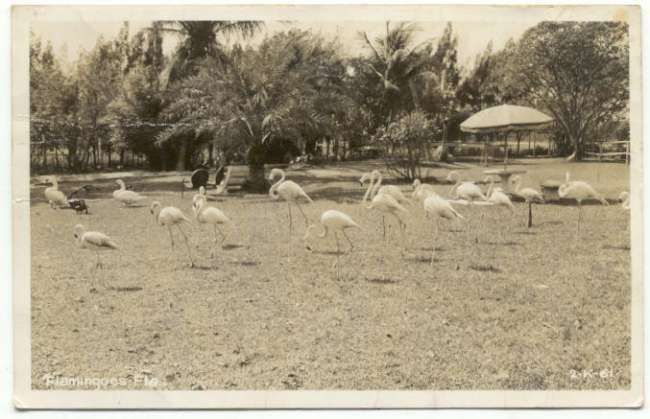 I'm not sure if these wonderful birds are commonplace in Florida these days. I do know that there was a lot of "Flamingo" lawn furniture (in steel) patterned basically depicting them for many years. Photographed is a bunch of our feathered friends congregating upon a grassy area somewhere in Florida around 50 years ago. |