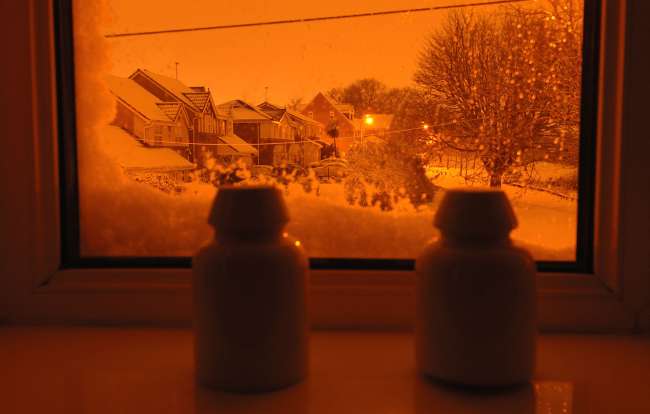 A view looking out of one of the windows. Strong winds have caused the snow to pack against the window. It is unusual for us to have snow this early.