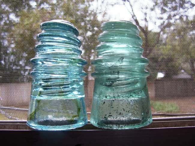 Here is a picture of two of my favorite insulators. One has great amber, and the greenish colored one has great carbon. Hope ya enjoy the pic.