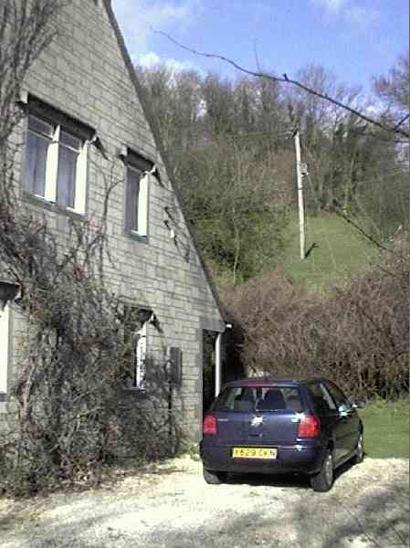 This sets the scene. The pole can be seen in the background. We rented this house in Owlpen Manor for four days. As I'm used to building codes that require all wiring in conduit, the English wiring seems a little scary! See the next picture for a close-up of the insulators. [IFONA] |
