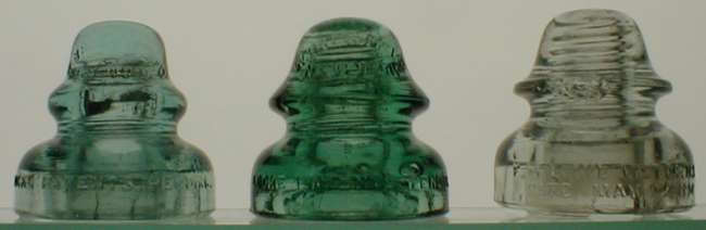 The insulator on the left is the Brookfield style with the narrow dome. The center insulator is the Brookfield style with the wide dome. The insulator on the right is the F M Locke style. Please note that the wide dome Brookfield sits flat on its outer skirt. The F M Locke example does sit on the inner skirt. This insulator was on display at Springfield along with another example. In talking with the owner of the other example we felt that these were the only 2 examples of this insulator known in the hobby. |