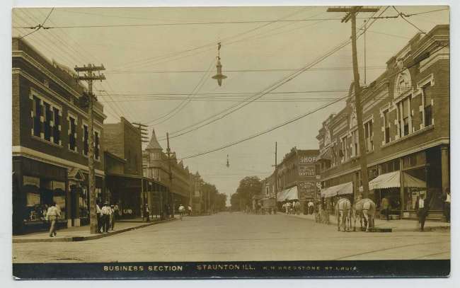 Picture taken along the business district of Staunton, IL. Clearly seen in the foreground are two enclosed type electric arc lights. These were lowered to the street via a pulley and crank mechanism for periodic maintenance. The pulley for the foremost fixture can be seen immediately above the luminaire. On both sides of the street are electric distribution circuits with an old transformer near the top of the pole on the extreme right. |