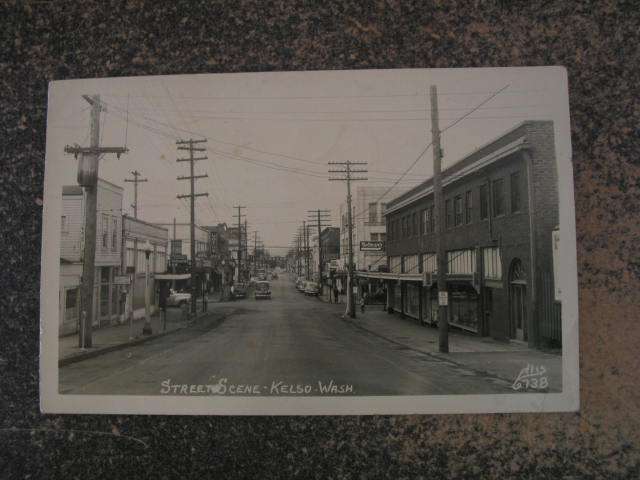 This picture is among Joe M's collection and depicts what the street scene looked like in Kelso, WA probably in the later 1940s. As shown are old time electric distribution lines along the left with three-to-four crossarm open wire telephone lines running along the right side of the street as you see here. |