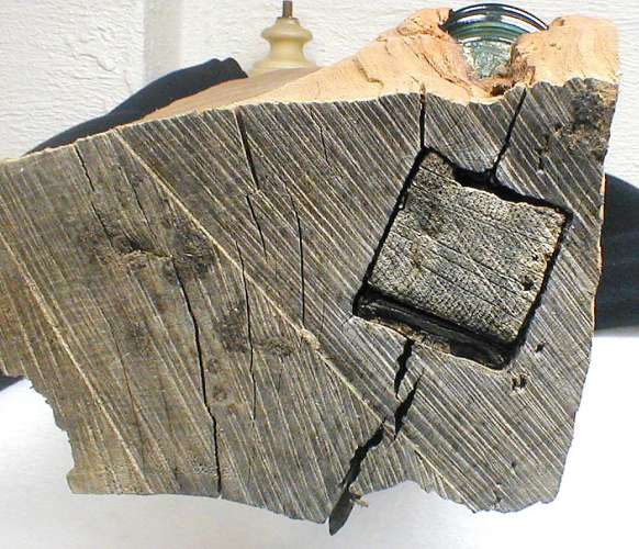 This is the crosscut bottom view of this cool encased insulator. You can see the original nail sticking thru the back. You can also see the original bark still trapped underneath the sidepin when it was grown around. This tree must have grown really fast to engulf this rather than force it off. I nailed a sidepin on a tree 14 years ago and watched to see what it would do. After about 6 years the pin was finally forcibly removed by the growth of the tree thus indicating that the slower growth rate created enough pressure to break and slough the pin off before the tree had a chance to grow around the pin. |