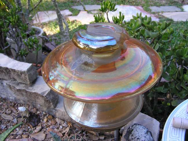 Here is one of our CD 327s with a flashover. As you can see the carnival coating was blistered away. The rough texture at the top of the mark appears to be metal fused into the glass. The wrinkling you see was caused by the heat and is actually in the surface of underlying glass. Keep in mind this is boro-silicate glass, similar to your glass cookware. We do not know if this was caused by a direct lighting strike or an over voltage from a strike or other source. |