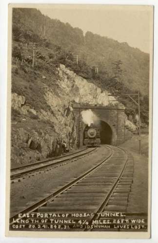 This photograph depicts the 4.25 mile, 26 foot wide line tunnel that remains as an incredible piece of railway history and wonder! Note how the six-pin crossarm telegraph line traversed in the hillside above the tunnel. It is probable this method of line construction was typical in other locations. Good to keep in mind when poking around where telegraph lines went above tunnels like this one. |