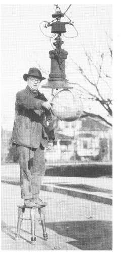 This PGE (Portland General Electric Co.) employee was known as an "Arc Trimmer" and spent many years at this job in Portland, OR. The lamps could be lowered on a cable with a pulley for maintenance and raised back to the normal height when the work was done. Note the stool with insulators he is standing on. He was taking no chances with electricity. The picture was reported to be in 1927. (courtesy P.G.E.) |