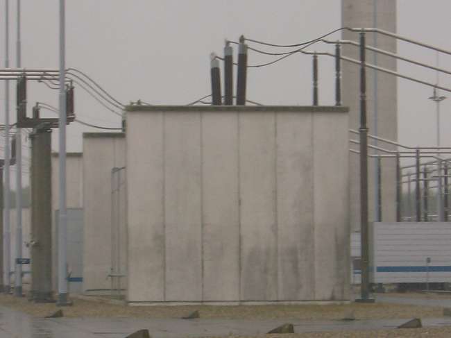 Behind this wall are the transformers, The voltage will be transformed from 380 KV into 110 KV.