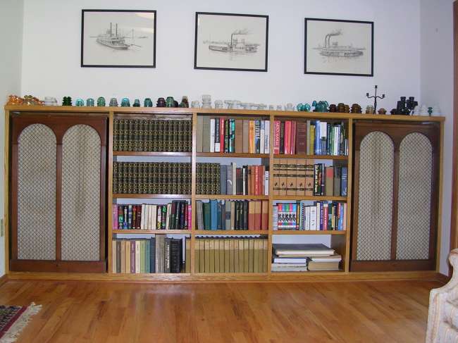When most people hear the term "bookshelf speakers" they usually don't think of monsters like these 40 year old Bozaks. No shelf looks right without insulators, so I have also filled that obligation as well, a mix of PIFONA (Porcelain Insulators From Outside of North America), and of course, some glass both of foreign and domestic origin . The riverboat drawings were dome by my Uncle Frank, arout 50 years ago. |