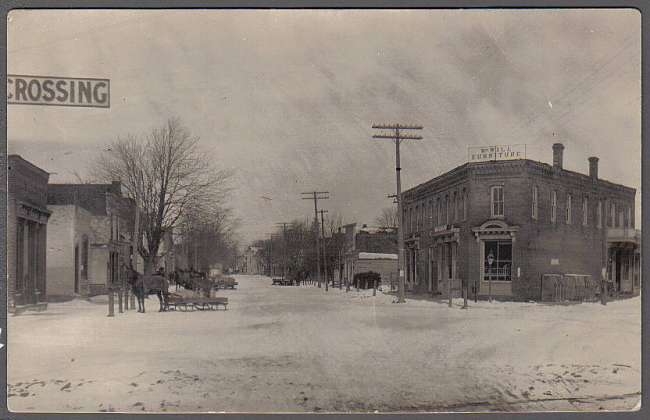 This is the second of two photos taken in the same location, two years apart. For a 1906 sunny day view from the same vantage point, see here [id=203563532] . The above photograph depicts street scenery of this Michigan community on a rather snowy day with what looks like a telephone open wire line on the right with low voltage electric distribution immediately below. I wonder what a photograph taken in the same location today (100 years later) would look like... |