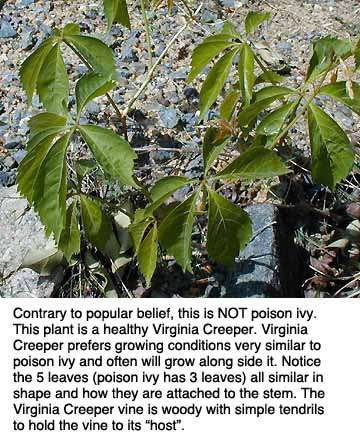 Here is a good closeup picture of Virginia creeper vine. Note that this has a palmated 5 leaf group and does look strikingly like it's poisonous brethern. This vine is extremely common thru out the entire United states in the colder and semi cool climates and to the West coast and can grow in and among poison ivy with ease. Fall foliage colours are about the same as poison ivy. |