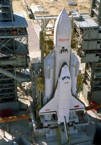Unlike out Space Shuttle, of which this is an obvoius copy, theirs (named Buran, translates to "Snowstorm" ) only flew once, and without a human crew, it was flown on remote control or autonomous function. After it landed, the white heat tiles looked rather "toasted". The name on the booster rocket reads "Energiya" |