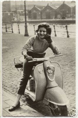 Photograph of a nice looking gal posing upon one of a great many Vespa motor scooters that made their way into the United States by the mid-1960s. These cool two-wheeled "bikes" ran nearly forever on a gallon's worth of gas (at 29 cents a gallon then!). Here in MA you had to register your scooter as a motorcycle opposed to tooling around with it without a registration or license plate. At any rate, these were a super nifty (and thrifty) and fun way to get around in those days! I didn't own one (was not old enough to own a drivers license then). However my dad had one for a few years in the mid-60s. It was an economical "second car" that got him to work and back every day (10 miles one-way) while my mother drove our 1966 Buick sedan to and from her job. |