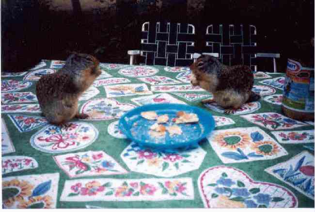 On one of our collecting trips, we had guests drop in for breakfast. These are ground squirrels, and while quite tame, are not to be handled. They ate all the toast with peanut butter on it first, then ate what was left. At times, we had as many as 8 of these guys up on the table. We finished our breakfast standing, and let them use the table. |
