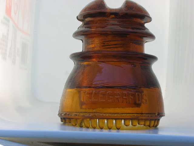 This is a beautiful Telegragos Nacionales ( I call it) Orange amber CD 214 "Long tooth". It had some really long drip points on one or two sides. This one is in really nice condition with only one drip point chipped.