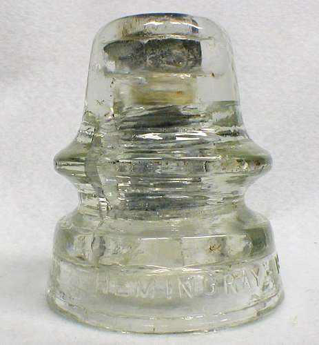 Here is another addition to my collection of rare pieces, a CD 186.2 Hemingray 19 signal. These are extremely bizarre insulators having a lead lined pinhole and for reasons completely unknown to me, a large 6 sided hex nut in the dome with an opening. Maybe they would screw some type of connector into this machine threaded hex nut? If anyone has any other info to share on this, I would love to know please. Not perfect, but whole nonetheless. Has a large crack on the rear skirt and around the midriff of the dome. |