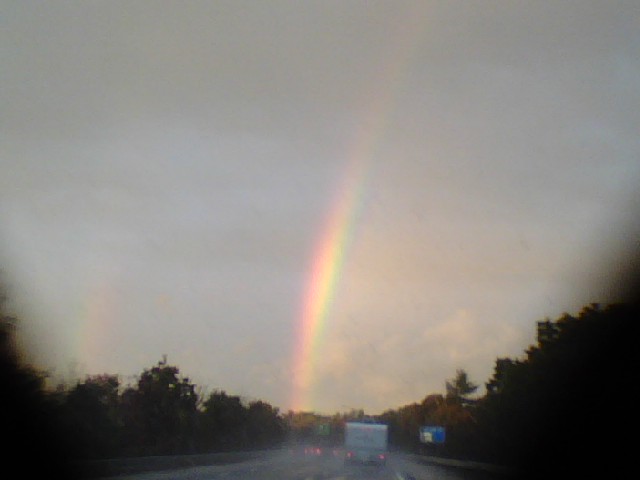 To see a good strong deep colored rainbow isn't common. In this case, the conditions happened to be right for a second fainter rainbow to form. (look at the left of the picture). This was taken quickly with a cell phone camera. By the time we were able to stop and grab the "real" camera, the viewing angle wasn't as good, and the rainbow was not as intense. Still, this picture is pretty impressive, IMHO! |