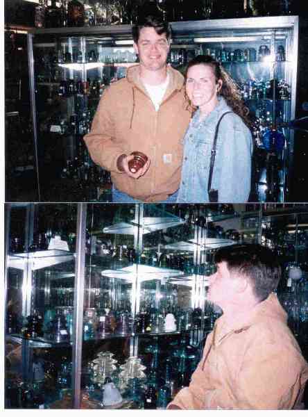 A couple of pics of Pat & Melanie looking at some of David Bethman's insulators at the I-5 Antique Mall, located just south of Ferndale, Wa. I had picked them up at the Seattle airport, and we were on our way to Canada customs. It was too good an opportunity to miss seeing David's insulator display. If you are in the area, you should stop in to see David. He's a really nice fellow, with great insulators available. We certainly enjoyed David's setup. |