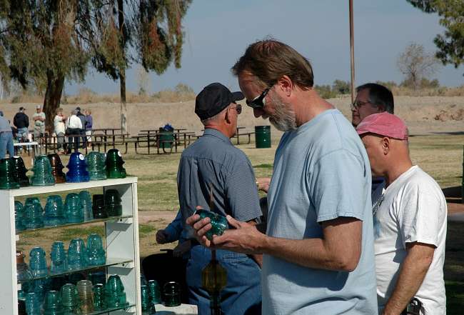 Roger Nagel contemplating a last minute purchase from Richard Dawson's table. Is that a Gregory he's holding? Yep, it sure is! James Doty stands behind Roger in the light red cap keeping a watchful eye open for those rare ponies. Just another beautiful 70 degree day in February that allowed nearly 100 collectors to gather in Yuma Arizona for fun in the sun! |