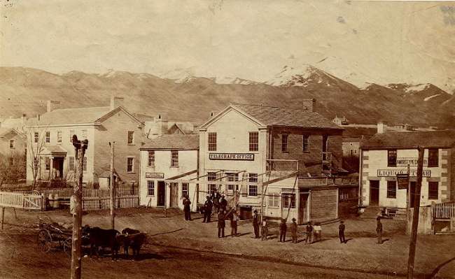 Photograph of the S.L.C. Telegraph Office. The photo is believed to be circa 1865. Note the wooden covered Wade Type Insulators on the pole in the foreground as well as across the road. A number of Wade insulators have been dug in the downtown Salt Lake City area by bottle collectors over the years. |