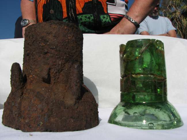 Here's a pic of the "Wolfman" insulator that showed up at the recent Yuma Tailgater. James Doty was kind enough to bring this one and several other great pieces from his collection for Show and Tell. The couple of undetectable repairs to the Metal cover were expertly done by James. I'll post more pics of the tailgater as soon as I catch up with things in the office. Enjoy, DAN |