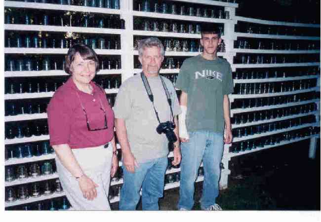 This is Curtis Erickson with his Mom and Dad. They were passing through Vancouver, on their way to Alaska, [2001], and stopped in for a visit, to see my collection. Check out the busted wing on Curtis. Told me he fell out of a tree. I never found any insulators in trees, yet, but I'll keep looking. |