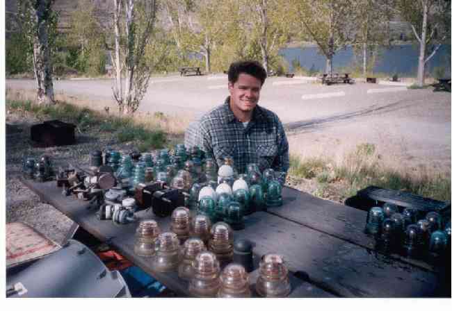 Pat Scott of St. Louis, Mo., visiting supernatural, and beautiful B.C. [May-2001] We have just finished breakfast, and are relaxing in the campground, before heading out for another day of plundering. Couldn't be better. Good friends, sunshine, and lots of insulators. |