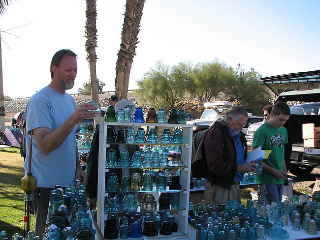 Roger Nagel checking out a few of Richard Dawsons fine pieces while Matthew Gauron (far right) sends a picture of a piece with his phone to his buddy Killian (who couldn't make it) back in Colorado Springs for approval before purchasing it. Look at the great glass on the Richards shelf |