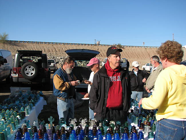 John McDougald speaking with a customer. Richard Dawson & James Doty (left back) discuss glass and Tom Katonak (back right) enjoys the sun. Tom Katonak & John McDougald shared tables to display the many new pieces now available from a recently aquired collection of nice glass. Just look at the field of blues sitting there. |