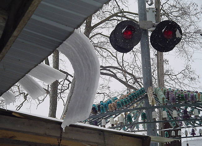 This happens once in a while. The snow starts to melt and begins to slowly slide off the metal roof in strips between the ridges. Usually they hang straight down until their weight causes them to break. With the conditions today the strips have curled back towards the building as they refroze. That's my story and I'm sticking to it. |