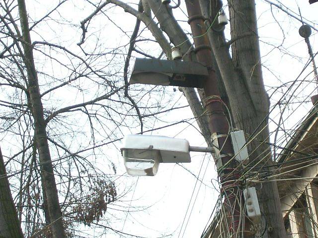 Now...to start, find the black and white wires that operate the street light (below, which superceded the one above when it apparently failed and was left there for posterity?). And while you are up there monkeying around in that tree (surrounding the original steel pole which now is well "retired") find the comm wire that leads to your humble abode for your connection with the outside world. |